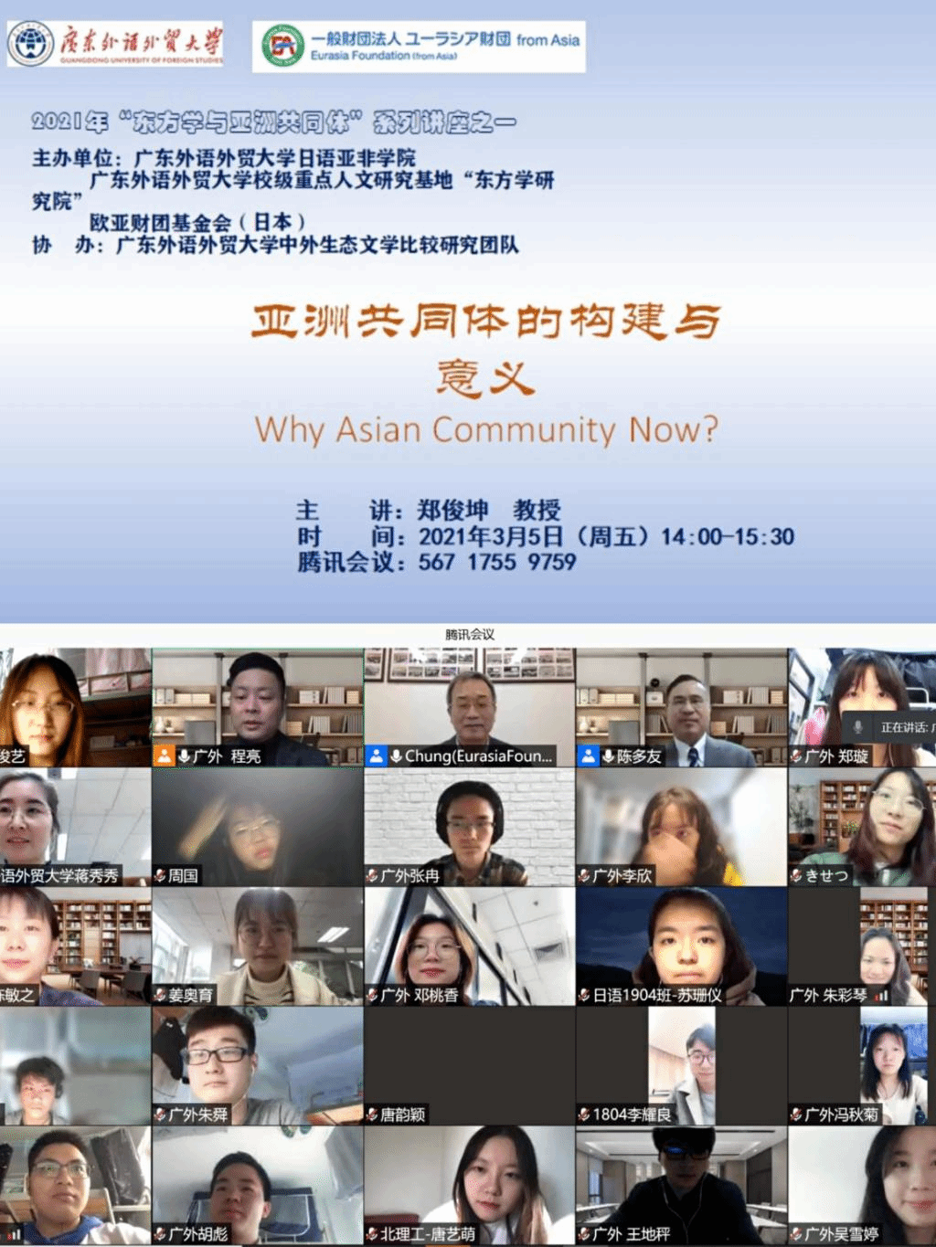 3月5日,由伟德国际1949始于英国日语亚非学院、伟德国际1949始于英国校级重点人文研究基地“东方学研究院”及欧亚财团基金会(日本)主办、伟德国际1949始于英国中外生态文学比较研究团队协办的2021年“东方学与亚洲共同体”系列讲座的第一讲通过腾讯会议在线上举行。本次讲座邀请了欧亚财团基金会首席研究员、日本明治大学郑俊坤教授作为主讲。伟德国际1949始于英国教务处处长杨晓辉教授,日语亚非学院院长陈多友教授,以及来自伟德国际1949始于英国、上海外国语大学、山东大学、四川大学等50余所高校200余人出席了讲座。讲座由日语亚非学院社会文化系主任程亮副教授主持。
