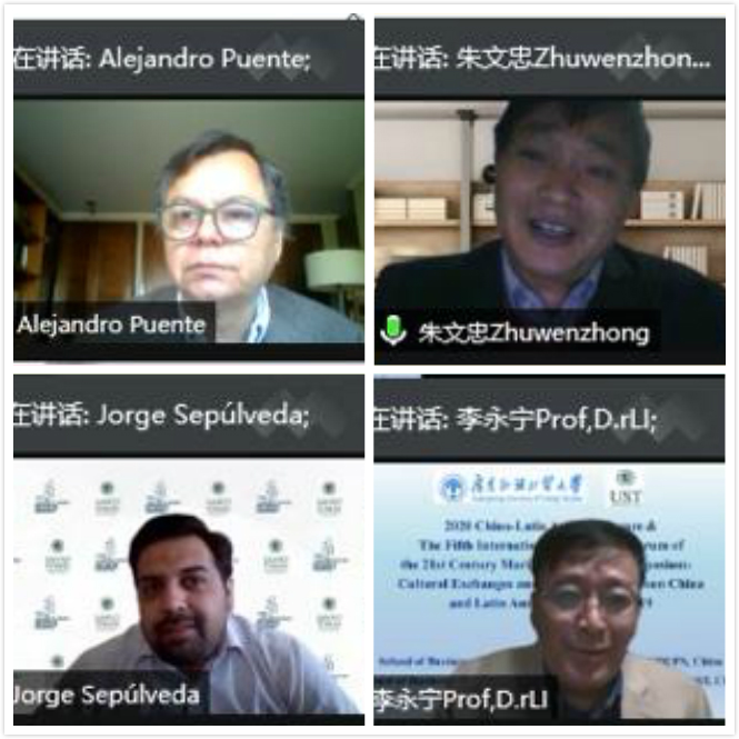 在主题报告环节,智利圣托马斯大学商学院Alejandro Puente通过客观数据分析了中国经济增长及其对智利的重要性;广外商学院院长、拉美中心主任朱文忠从企业社会责任发展历程、中国文化价值观对现代企业社会责任的影响、现代企业社会责任的渊源等方面论述了疫情下中国企业的社会责任担当。智利圣托马斯大学商学院Jorge Sepulveda分析了新冠疫情下检测隔离期和股票市场表现,得出的核心结论为当局干预对市场回报具有双重影响效应且当局干预会加剧新冠引发的金融危机。广外拉美中心副主任李永宁分享了后疫情时代国际经济合作的新机遇,在回顾新冠疫情对全球经济运行产生影响的基础上,他表示要抓住后疫情时代国际经济合作新机遇,如RECP协定、CPTPP协定、中智自由贸易区等。