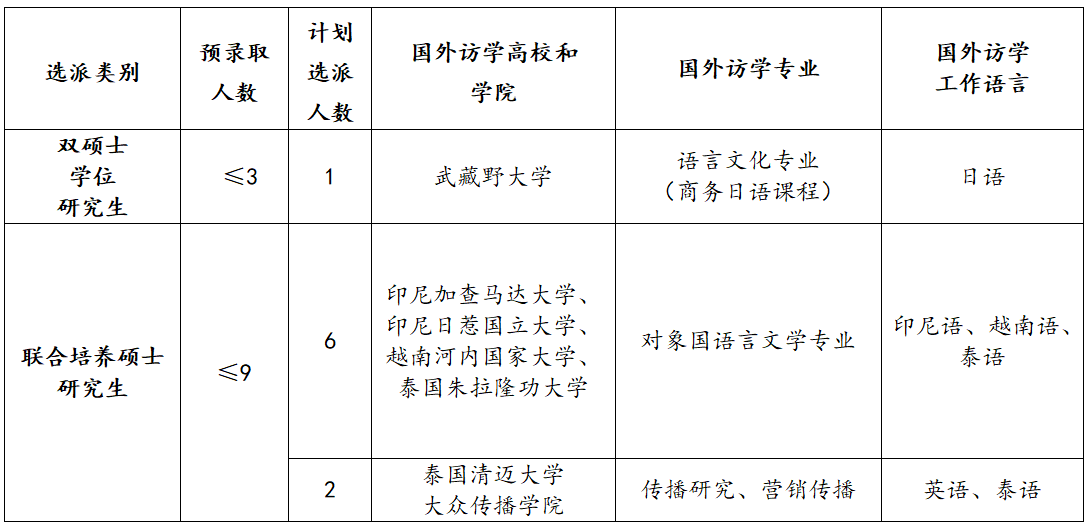 以上选派对象将根据国外院校合作需要和报名情况择优录取。具体项目类别及计划选拔名额如下: